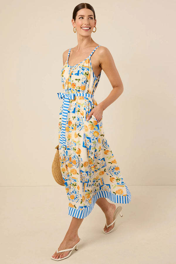 Name | Spaghetti Straps Self-Tie Belted Waist Icon Print Striped Trim Dress | ||