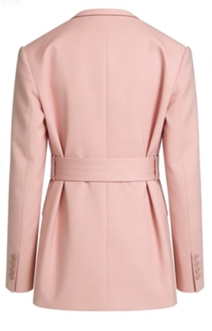 This is a soft blush-pink tailored blazer with a sleek, structured silhouette. It features a deep V-neckline (from the front view), wide lapels that lend a polished vibe, and a cinching waist belt (with a clean rectangular buckle) that adds a flattering shape. The front showcases double-breasted buttons for a timeless touch, paired with neat flap pockets that keep the look refined yet functional. Its smooth fabric has a subtle, luxurious drape, while the long sleeves and fitted hem contribute to an elegant and versatile design—perfect for both formal and elevated casual outfits.